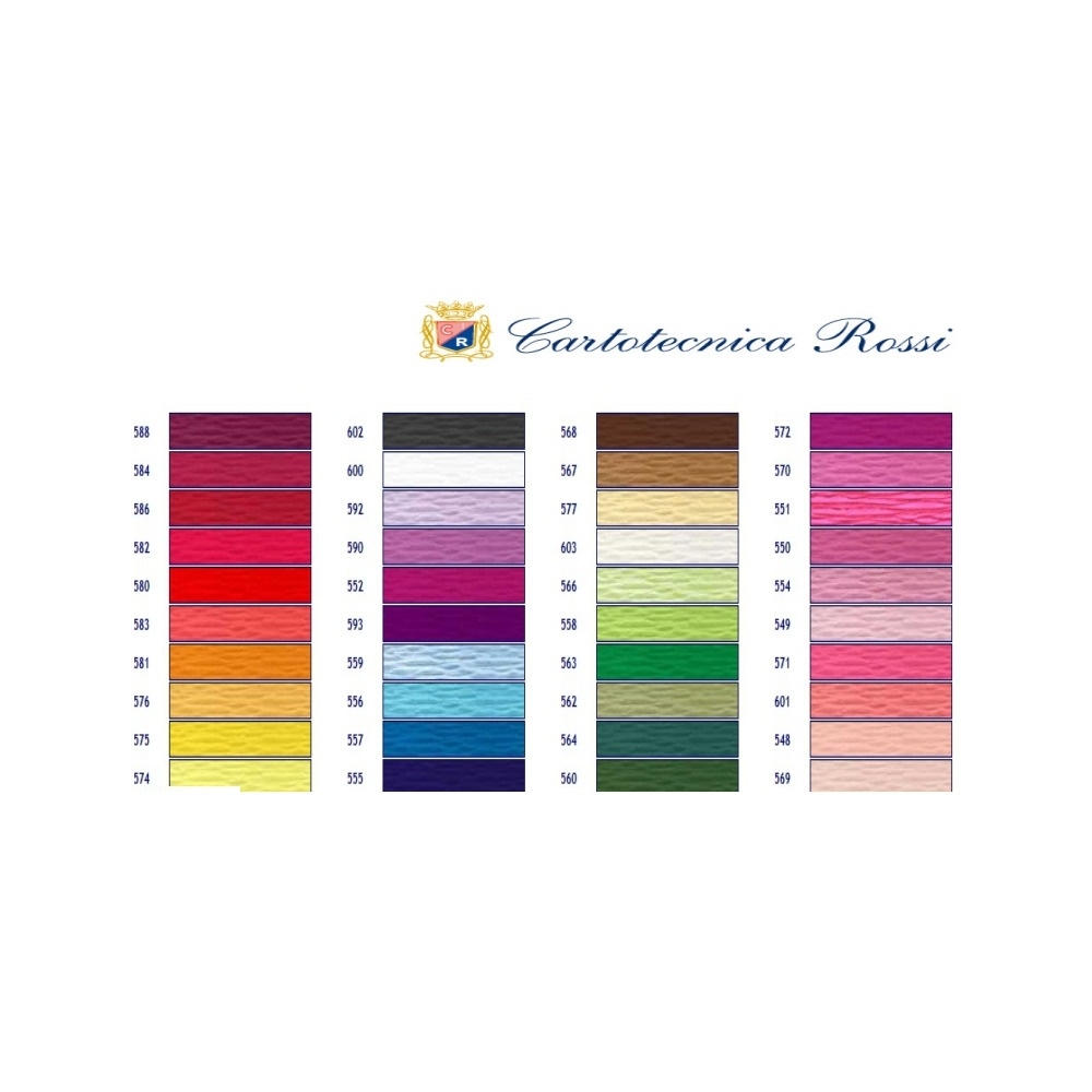 Bibuła dekoracyjna karbowana 50 x 250cm. Gramatura papieru 180g/m_ ._Stopień marszczenia 200%. Opakowanie jednostkowe, worek foliowy zawiera _5 rolek zawiniętych oddzielnie w przezroczystą folię._Artykuł produkcji włoskiej.