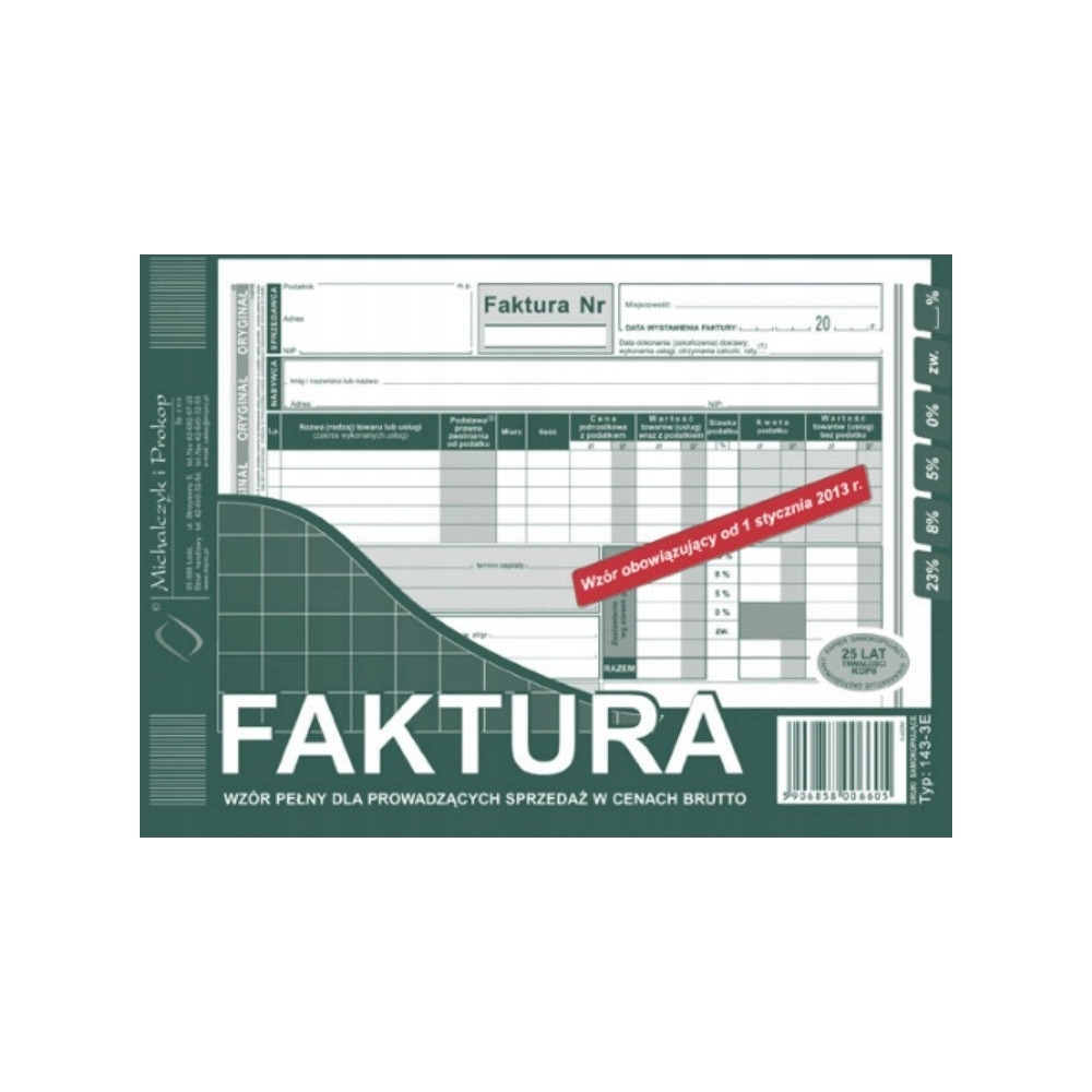 143-3E Faktura VAT MICHALCZYK&PROKOP A5 80 kartek Kod produktu: 0067117 Kod EAN: 5906858006605 Pobierz stronę w PDF Warianty Opis produktu Warianty Opis produktu 143-3E Faktura VAT MICHALCZYK&PROKOP A5 80 kartekFaktura VAT brutto (pelna), A5 (o+1k)